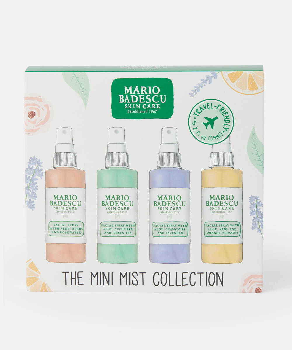 Mario Badescus The Mini Mist Collection is a collection of four travel sized facial sprays for on the go hydration. Collection includes: Facial Spray with Aloe, Herbs and Rosewater 2.0 oz Rejuvenates and clarifies Facial Spray with Aloe, Cucumber and Green Tea 2.0 oz Invigorates and refreshes Facial Spray with Aloe, Chamomile and Lavender 2.0 oz Balances and brightens Facial Spray with Aloe, Sage and Orange Blossom 2.0 oz Uplifts and replenishes.